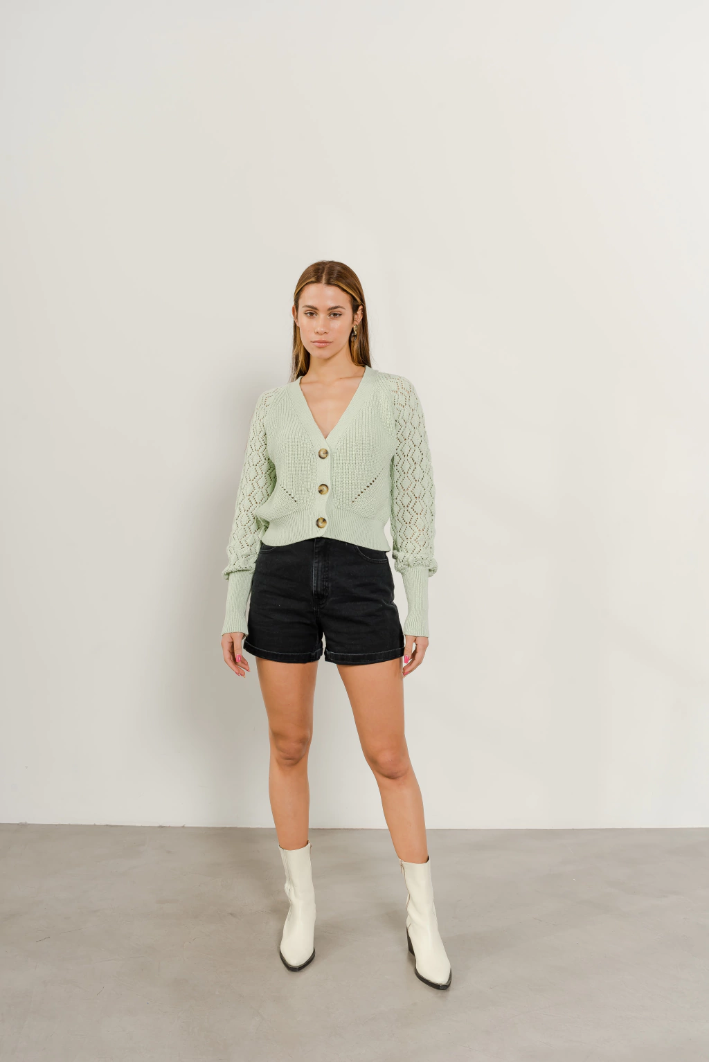 Descripcion: Cardigan a la cintura con mangas ranglan caladas y puño ajustado. Composicion: 50% algodon / 50% lino