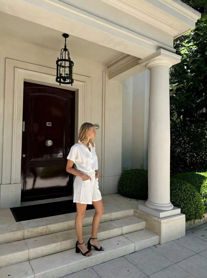 Enterito corto, con cuello camisero, cintrura elastizada y bolsillos laterales. Composición: 70% Viscosa / 30% Lino