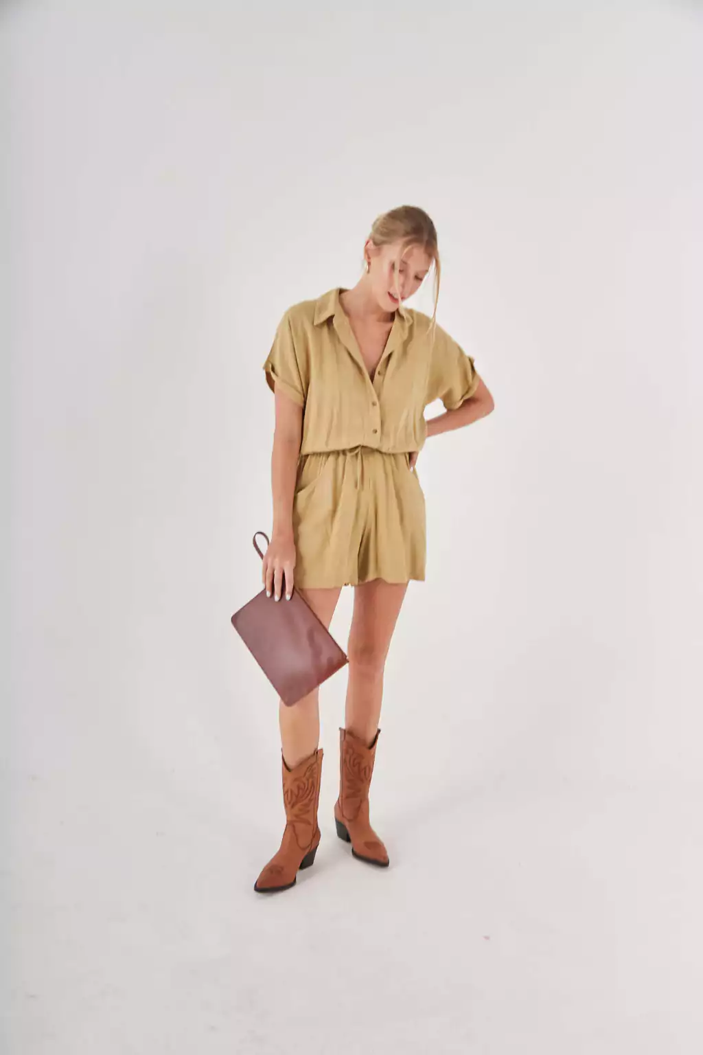 El color Camel, que se asemeja a un tono Verde Seco, añade un toque de originalidad. Ten en cuenta que los colores pueden variar en la foto, y este enterito ofrece un tono de Camel que se inclina hacia un sutil Verde Seco.