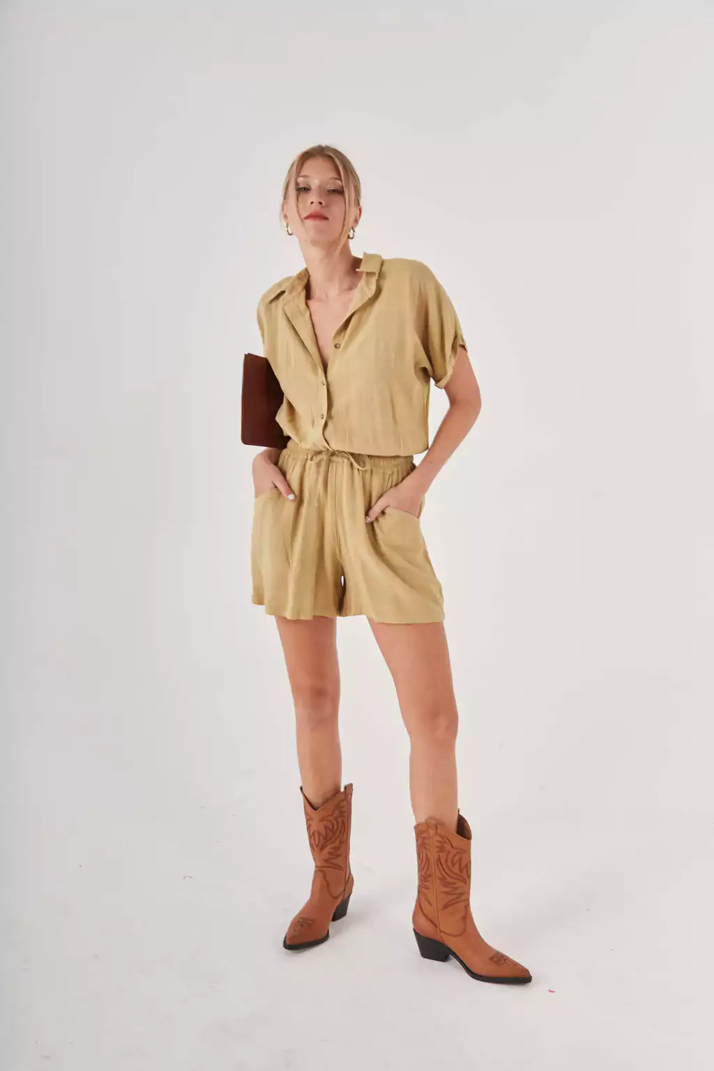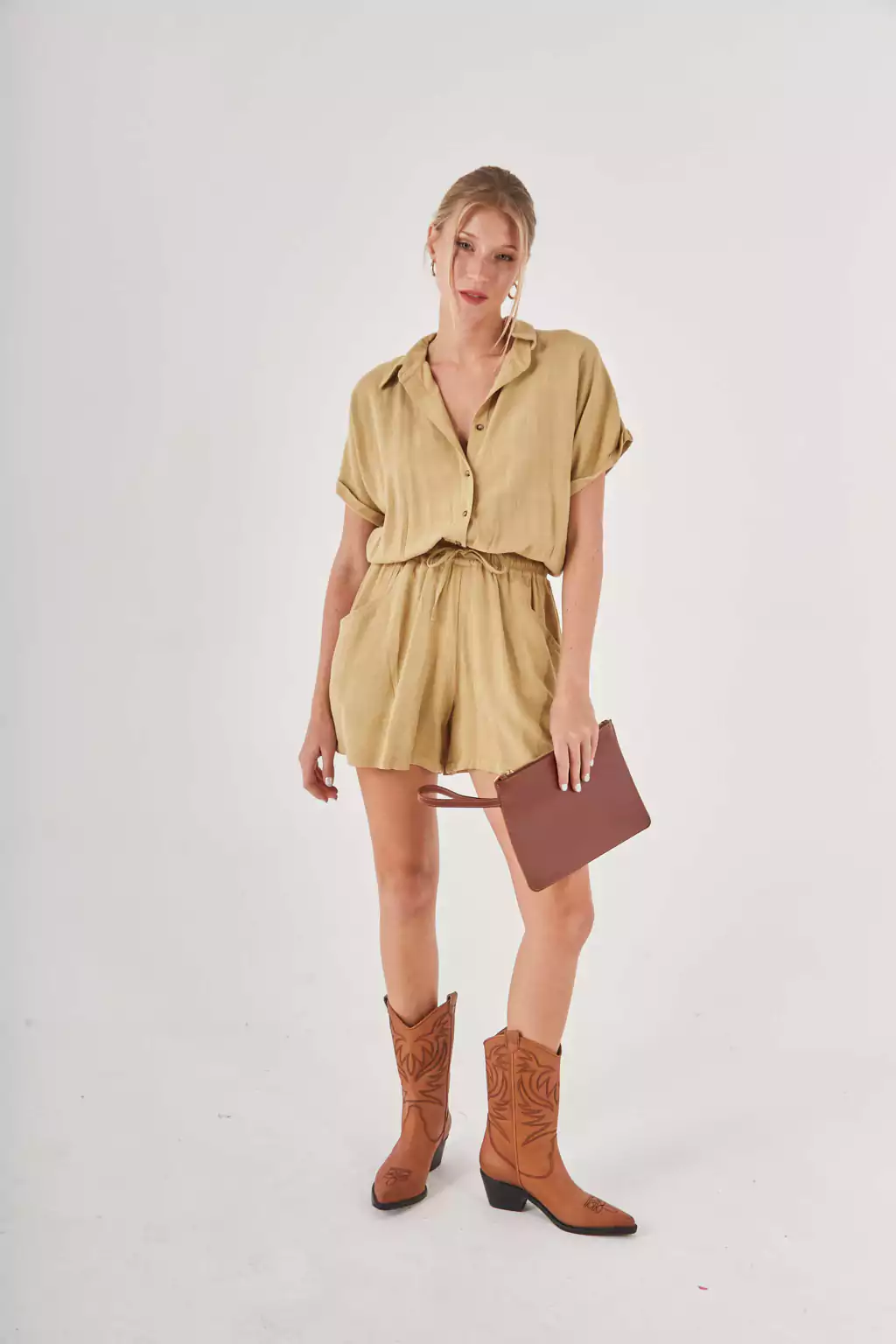 Enterito corto, con cuello camisero, cintrura elastizada y bolsillos laterales. Composición: 70% Viscosa / 30% Lino