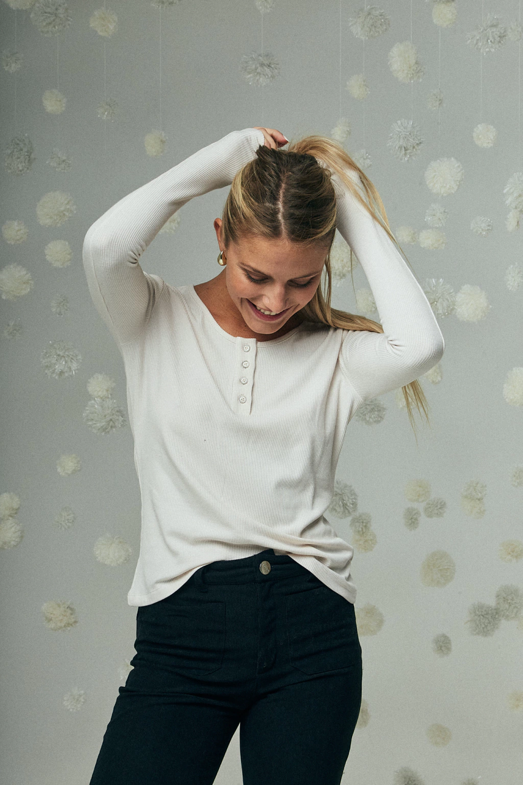 La Remera Cameron es un básico funcional con un toque especial. Confeccionada en morley frizado, tiene mangas largas, cuello redondo y una cartera con botones al tono que suma detalle y estructura. Gracias a su composición con rayón y lycra, ofrece una textura suave, térmica y con buena elasticidad. Disponible en nude y off white, es una prenda perfecta para usar sola o como capa base durante el invierno.