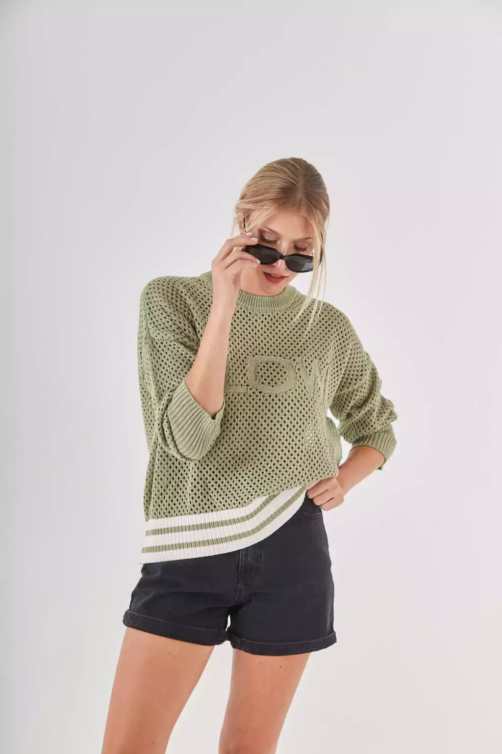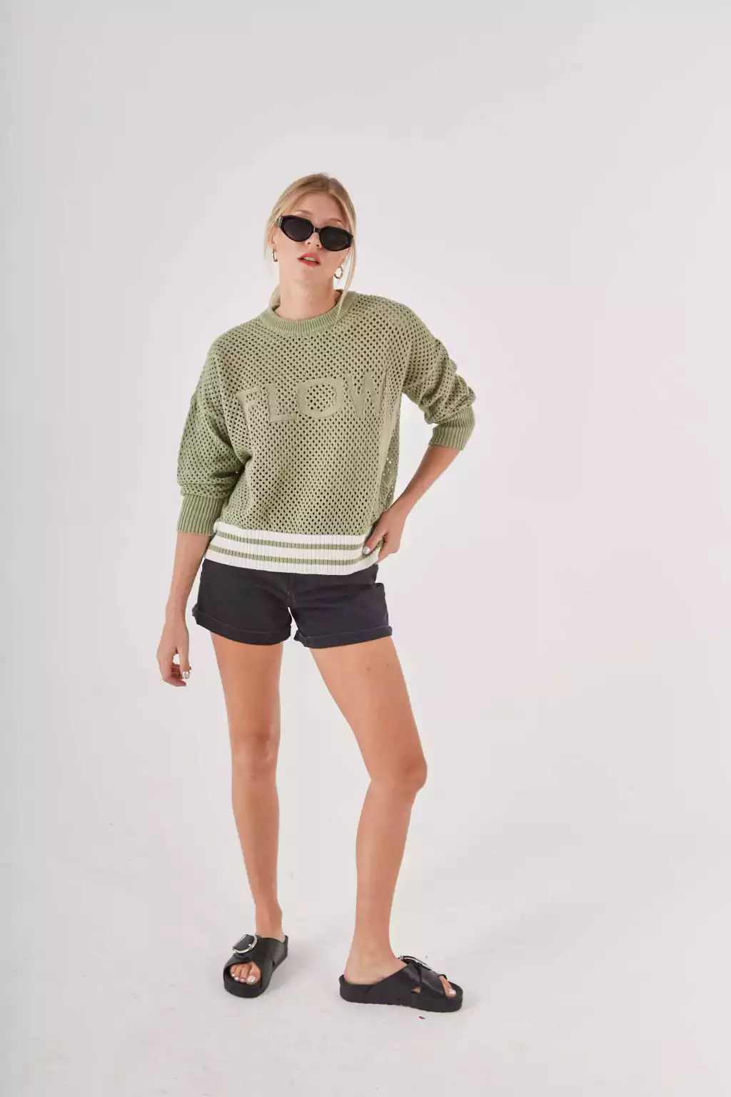 Sweater oversize calado con escote redondo, puños ajustados y cintura a contratono. Composicion: 50% algodon / 50% lino.