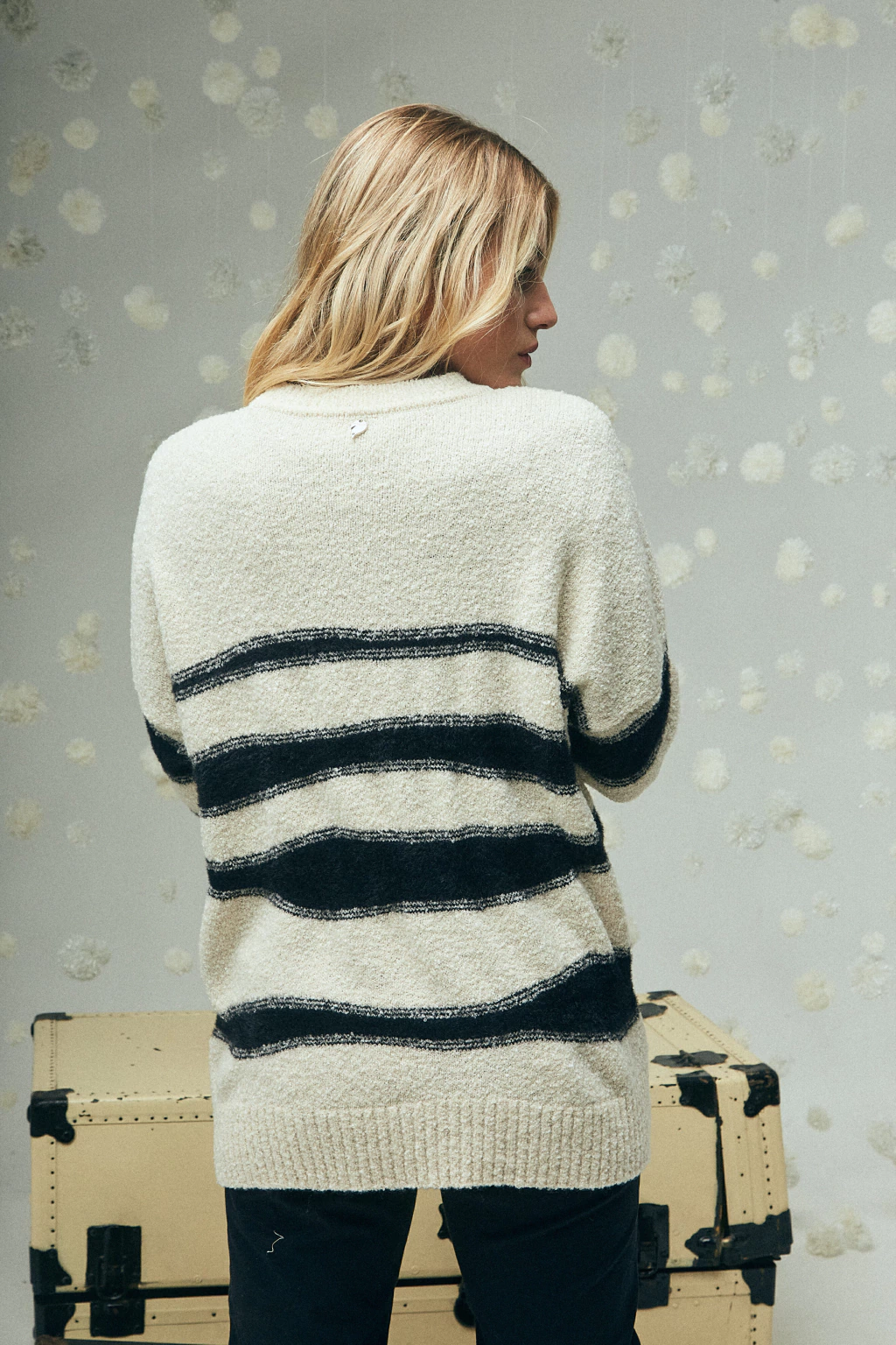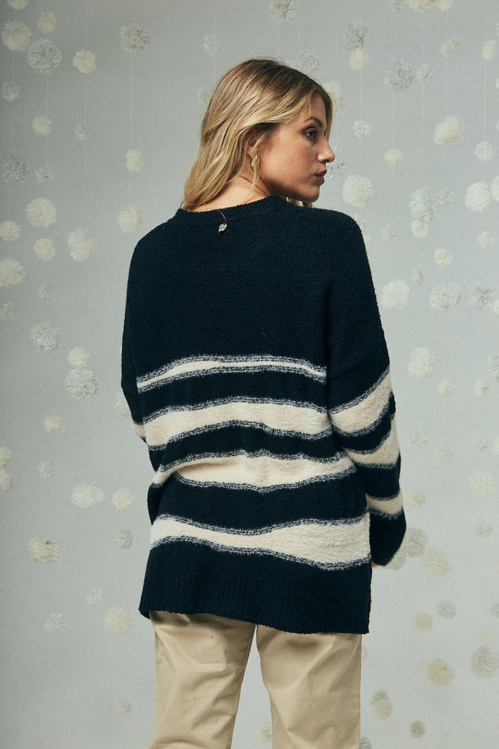 El Sweater Roma se destaca por sus rayas irregulares y la combinación de hilados que le otorgan una textura única: buclé y chenille en contraste. Su silueta oversize, cuello redondo y caída amplia lo hacen ideal para quienes buscan abrigo y elegancia en una sola prenda. Disponible en negro, es perfecto para looks modernos, monocromáticos o con capas neutras. Una pieza con personalidad propia.