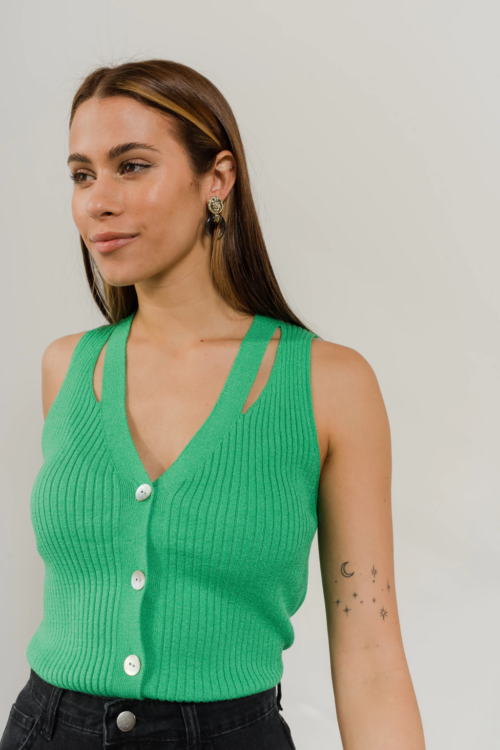 Descripción: Experimenta la elegancia con nuestro top tejido acanalado, realizado por una abotonadura central que añade un toque de sofisticación. Los tajos en el escote ofrecen un toque moderno y seductor, creando una prenda única para ocasiones especiales