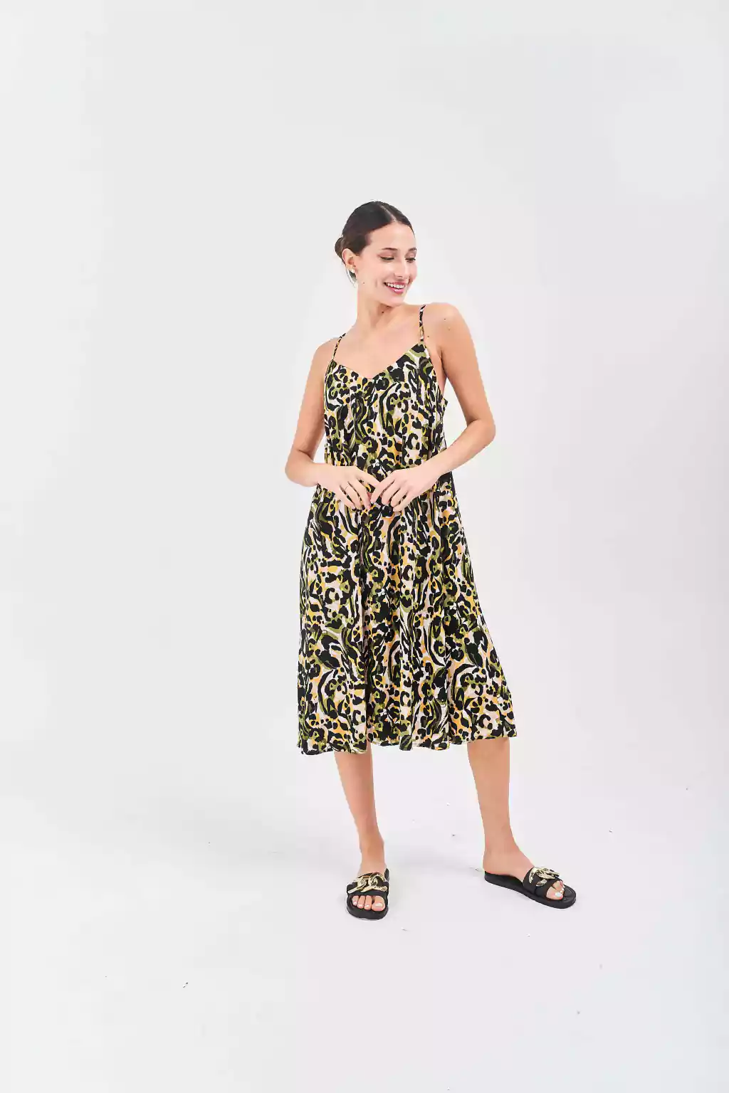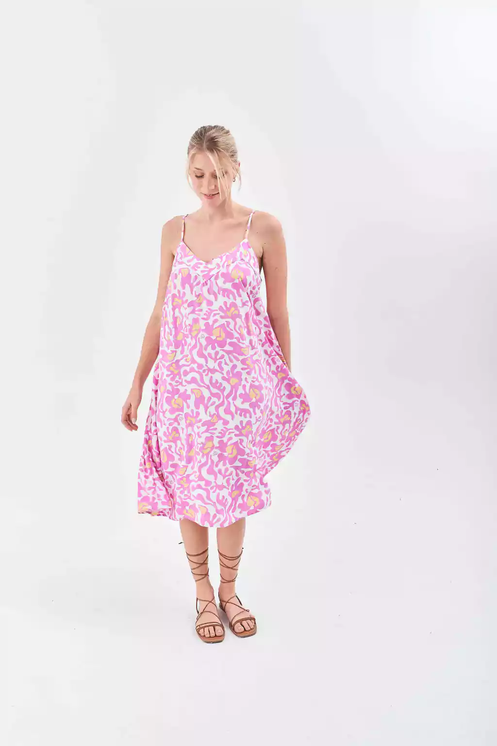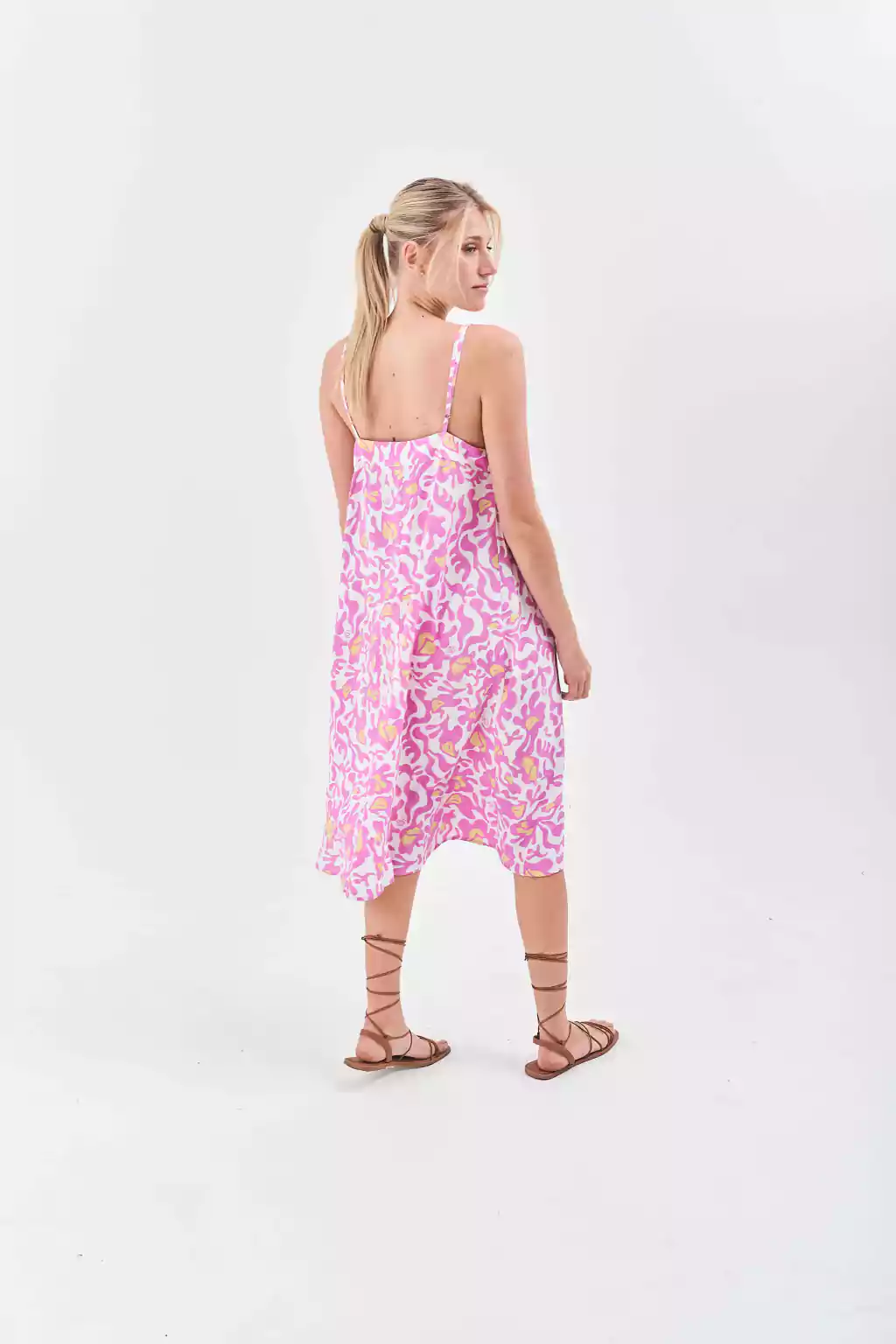 Descripción: Vestido corto confeccionado en Voile Rayón sin mangas, de escote V y calce holgado, con breteles finos para regular. La variante Fucsia y Rosa se cortaron con estampas personalizadas de la marca.
